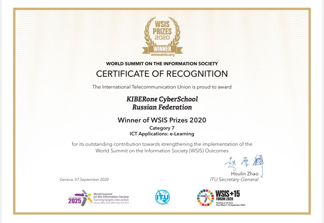 Признан лучшим проектом международного уровня в сфере цифрового образования по версии ЮНЕСКО. Победитель в ИТ-конкурсе WSIS Prizes 2020 в категории цифрового обучения.